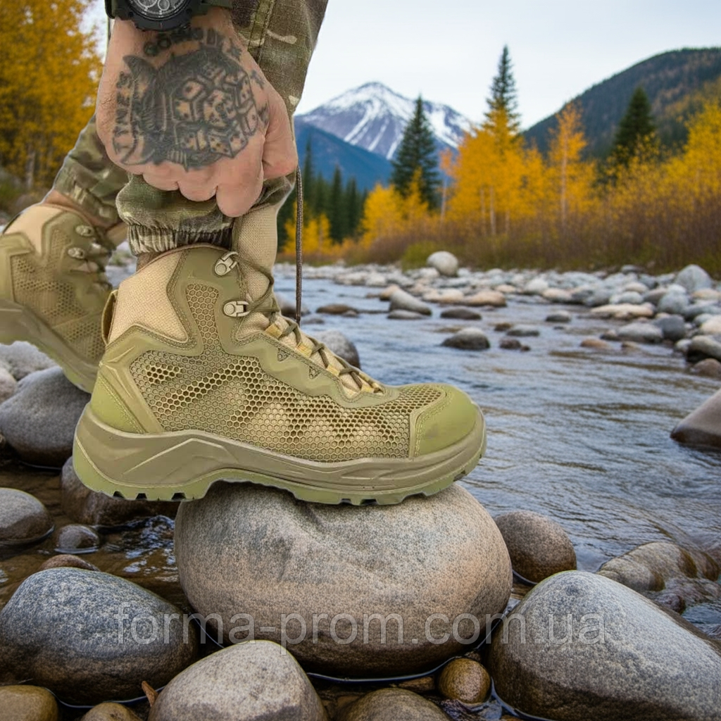 Нові Берці TALAN 1923 стільники койот Оліва 42р. • Підошва - "Cross" • Тришарова знімна устілка Сlimate Сontrol® • Мембрана – Gore-Tex® • Підкладка - Сlimate Сontrol® • Поліуретанова підошва Cross має різношарову конструкцію - вбудований нейлоновий елемент-стабілізатор, який забезпечує необхідну торсіонну жорсткість та гнучкість взуття під час ходьби, поліуретанова проміжна підошва Monowrap® відповідає за амортизацію та компенсацію вертикальних навантажень. • Загалом підошва дозволяє почуватися досить впевнено та комфортно як на пухкому, так і на вологому грунті.